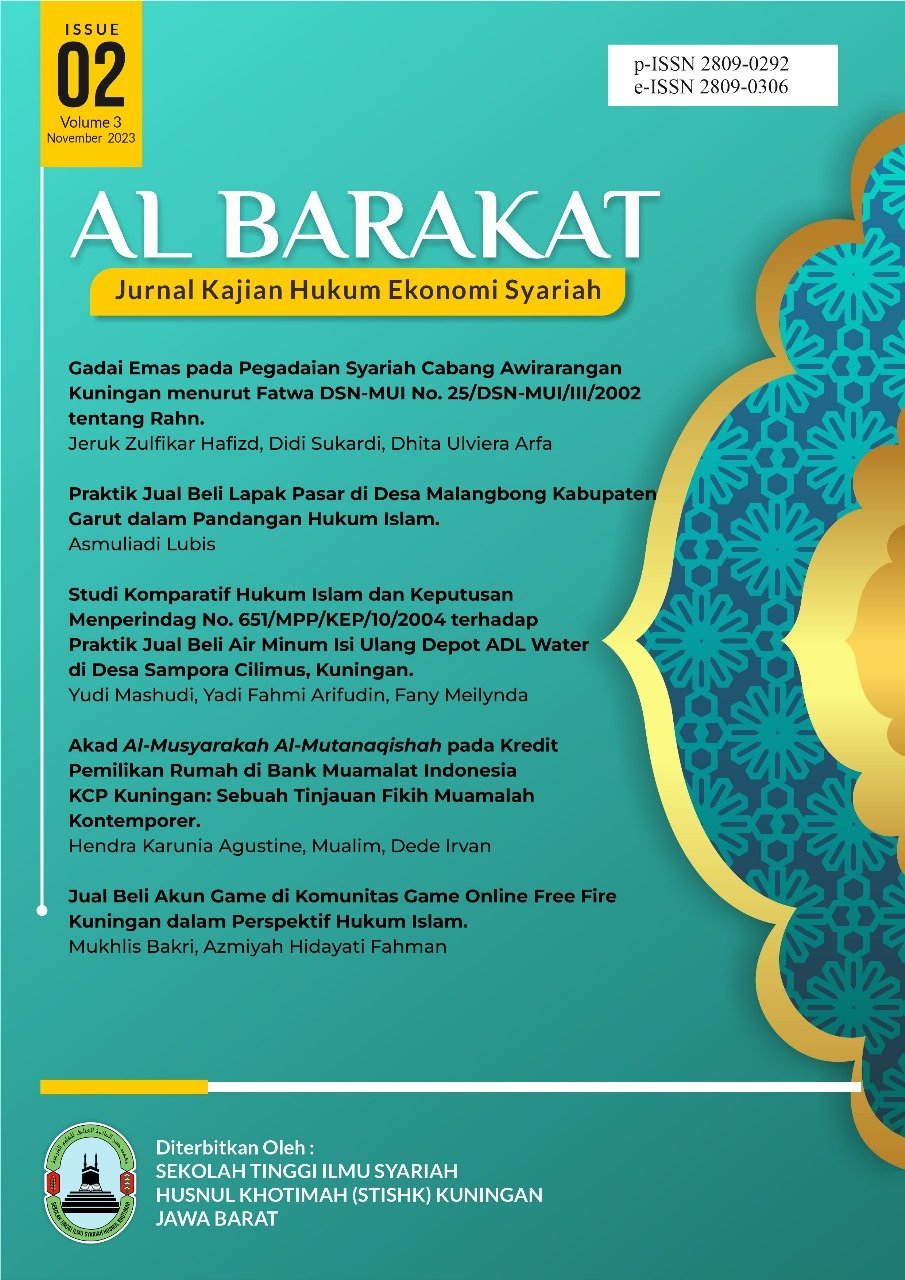 Jual beli akun game online ini tidaklah berbentuk fisik, akan tetapi hanya berbentuk sebuah akun yang terdiri dari id atau username dan password. Penjualan ini dalam praktiknya belum ada kepastian hukum Islam yang mengaturnya, baik mengenai proses transaksi jual belinya serta halal atau tidaknya jual beli tersebut. Pada penelitian ini terdapat dua permasalahan yang dikaji dalam skripsi ini, yaitu: 1) Bagaimana mekanisme jual beli akun game online yang dilakukan pada komunitas game online free fire di Kuningan, 2) Bagaimana Tinjauan Hukum Islam terhadap jual beli akun game online pada komunitas game online free fire di Kuningan. Tujuan dari penelitian ini ialah untuk mengetahui secara jelas bagaimana mekanisme jual beli akun game online pada komunitas game online free fire di Kuningan dan mengetahui hukum Islam terhadap jual beli akun game online tersebut. Dalam penelitian ini metode yang digunakan adalah metode kualitatif. Sumber data yang digunakan berupa data primer, yaitu wawancara terhadap penjual dan pembeli akun game online free fire, serta data sekunder sebagai pendukung diperoleh dari kajian pustaka seperti Al-Qur’an, hadits, buku, jurnal dan lainnya. Teknik pengumpulan data berupa wawancara, observasi dan dokumentasi. Teknik analisis data pada penelitian ini dengan cara deskriptif, yaitu data yang didapatkan kemudian direduksi, disajikan dan disimpulkan dengan menggunakan dasar hukun Islam. Hasil dari penelitian ini menjelaskan bahwa mekanisme jual beli akun game online free fire secara umum hukumnya sah karena telah memenuhi rukun dan syarat jual beli. Adapun transaksi online yang melibatkan pihak ketiga atau rekber (rekening bersama) dihukumi sebagai wakalah bil ujrah dan status adminnya ialah sah secara syar’i serta rukun maupun syaratnya dalam praktek jual belinya telah terpenuhi. Sehingga jual beli akun game online free fire dengan menggunakan akad wakalah bil ujrah hukumnya boleh.